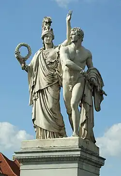 - ↑ W tłum. na j. pol. „Atena szkoli młodzieńca w posługiwaniu się bronią”.