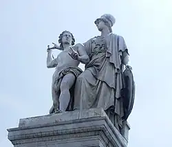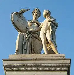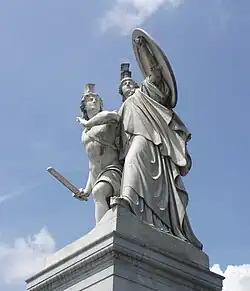 Na postumentach stoi łącznie osiem mających około 3 m wysokości, wykonanych z białego marmuru karraryjskiego kompozycji rzeźbiarskich[10]. Każda z kompozycji przedstawia scenę z udziałem bogini z mitologii greckiej: Ateny lub Nike i młodego wojownika[1][8][5].
