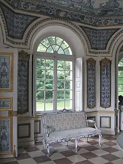 Na parterze znajduje się niewielka sala i dwa gabinety, natomiast na piętrze trzy gabinety: Pokój Wypoczynkowy (Ruhezimmer) o dekoracji nawiązującej do stylu regencji, ale zawierającej również elementy egzotyczne, Salon Chiński (Chinesische Salon) o ścianach pokrytych chińskimi tapetami i malowidłami z czarnej laki oraz Gabinet Chiński (Chinesische Kabinett) z malowidłami z czerwonej laki[9]. Na parterze dominują kolory niebieski i biały, które wraz z egzotycznymi, częściowo ornamentalnymi, częściowo figuralnymi malowidłami na suficie i płytkami holenderskimi na ścianach nawiązują do Chin i produkowanej tam porcelany.