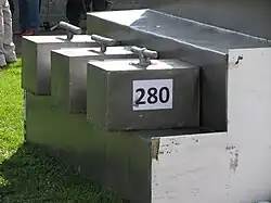 Ciężar ma formę stalowego prostopadłościanu, z uchwytami na dłonie na szczycie. Zawodnik podnosi go oburącz.