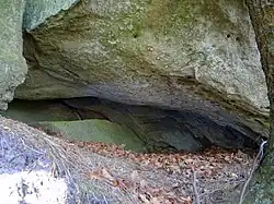 Schronisko znajduje się w grupie skał o nazwie Dwie Skały. Otwór znajduje się pod okapem. Ma długość około 2 m i wysokość 0,7 m. Za okapem jest korytarz o wysokości około 0,6 m, który zaraz zwęża się do 1,5 m, potem rozszerza do 2,5 m i znów zwęża do 1,5 m. Ma długość około 3 m. Na jego końcu znajduje się zawalona gruzem szczelina[1].
