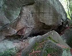 Schronisko znajduje się w skale w zachodniej części rezerwatu, przy ścieżce edukacyjnej prowadzącej przez ten rezerwat. Jego otwór znajduje się na północnej stronie ściany za wielkim głazem leżącym u jej podstawy. Ma postać sporej nyży pod okapem u podstawy skały. Okap ma szerokość 2 m i wysokość około 0,7 m, otwór nyży ma szerokość 4 m i wysokość około 0,7 m[1].