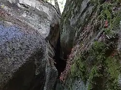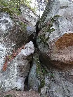 Schronisko Złoty Komin znajduje się w środkowej skale w kształcie kazalnicy. Przecięta jest ona dwoma pionowymi kominami. Jest to Złoty Komin (lewy) i Kruchy Komin (prawy). Obok skały z kominami zamontowano tablicę ścieżki dydaktycznej z opisem i zdjęciami[2].