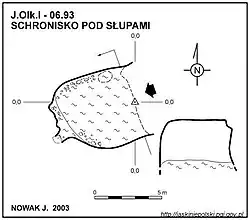 - 1 2 3 4 5 6 7 8 Jakub Nowak, Andrzej Górny, Schronisko pod Słupami, [w:] Jaskinie Polski [online], Państwowy Instytut Geologiczny – Państwowy Instytut Badawczy [dostęp 2019-11-28].