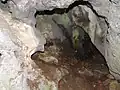 Od głównego otworu jaskini na północnym dziedzińcu prowadzi dość wysoki (1,6 m), ale niezbyt szeroki (ok. 1 m) korytarz, w którym po 6 m jest skrajnie trudny zacisk. Za zaciskiem korytarz staje się obszerniejszy i prowadzi do otworu południowego o wysokości 1,7 m i szerokości 1 m. W połowie odległości między tymi otworami jest jeszcze trzeci otwór o wysokości 0,5 m, za tym otworem jest dwumetrowej wysokości prożek i niewielka salka. W jej stropie są niewielkie kominki[1].