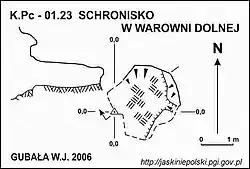 - 1 2 3 Wojciech J. Gubała, Schronisko w Warowni Dolnej, [w:] Jaskinie Polski [online], Państwowy Instytut Geologiczny – Państwowy Instytut Badawczy [dostęp 2020-04-25].