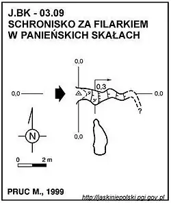 - 1 2 3 Marcin Pruc, Janusz Baryła, Schronisko za Filarkiem w Panieńskich Skałach, [w:] Jaskinie Polski [online], Państwowy Instytut Geologiczny – Państwowy Instytut Badawczy [dostęp 2019-11-02].