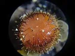 Typu apotecjum bez trzonu, o średnicy 1–3 mm, talerzykowate z niewyraźnym brzegiem, pokryte krótkimi, ciemnobrązowymi włoskami, występujące w grupach. Powierzchnia hymenialna w stanie świeżym jasnopomarańczowa do żółtawej[3].