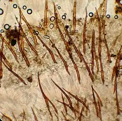 Worki cylindryczne, 8-zarodnikowe, jednorzędowe, nieamyloidowe, z nabrzmiałą podstawą, 204,6–302,8 × 13,0–21,5 µm. Askospory elipsoidalne, szkliste, z wieloma gutulami, ornamentowane guzkowatymi brodawkami o wymiarach 1,5–2,5 × 0,5–1,5 µm, Q = 1,3–1,7, Qe = 1,6, objętość 2,191 μm³ bez brodawek. Parafizy cylindryczne, septowane, u nasady rozwidlone, inkrustowane żółtoczerwonym barwnikiem, z pogrubionym wierzchołkiem 5,0-1,8 µm. Włoski grubościenne, septowane, ze spiczastym wierzchołkiem, u nasady rozszerzone, pojedynczo rozwidlonw, 257,1–539,2 × 18,8–29,5 µm[4].