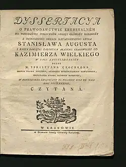 Na publicznym posiedzeniu Akademii zorganizowanym z okazji rocznicy jej powstania i imienin króla Stanisława Augusta Poniatowskiego, odczytał swoją „Dysertację o prawodawstwie kryminalnym” (1788), w której żądał „jednakowej kary dla ubogich i majętnych, dla pana i sługi, i to takiej kary, która by kryła w sobie tylko tyle surowości, ile potrzeba dla przykładu, a tyle ducha miłosierdzia, iżby była w stanie poprawić przestępcę”.