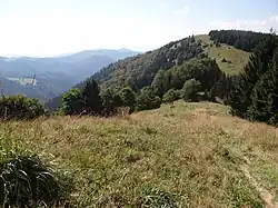 Widok z grzbietu Zwolenia. Sedlo Prípor i Motyčská hoľa po lewej stronie. W tle szczyty głównego grzbietu Wielkiej Fatry