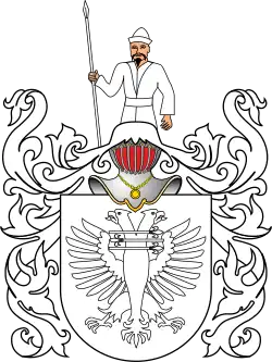 Klejnot: nad hełmem bez korony, Tatarzyn od pasa z włócznią w prawicy.