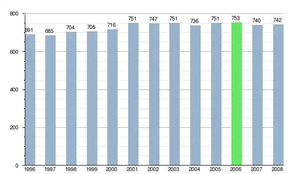 Według danych z dnia 31 grudnia 2012, wieś zamieszkiwały 732 osoby, w tym 359 kobiet i 373 mężczyzn[7].