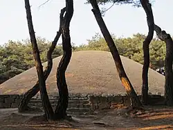 Królowa pochowana została w grobowcu na zboczu świętego wzgórza Nangsan w Gyeongju[1][2].