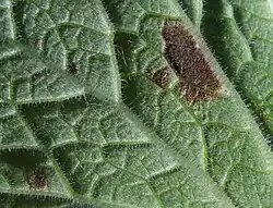 Na obydwu stronach porażonych liści powstają wielokątne, okrągławe lub elipsoidalne, ograniczone nerwacją plamy o wymiarach 2-5 (-10) x 2-4 mm. Początkowo są zielonobrązowe lub brązowe, potem czarnobrązowe i mają cienką, purpurową obwódkę oraz purpurowofioletowe halo[2].