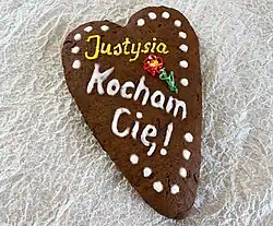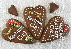 Serca piernikowe sprzedawane na jarmarku kaziukowym w przedwojennym Wilnie wyróżniały się kolorowymi zdobieniami z lukru, zdrobnieniami imion, od Aluś do Zosieniek. Charakterystyczne zdrobnienia imion przywołał poeta w wierszu Na Kaziuka (Piernik kusi, woła Kocham! / Izę, Jankę, Asię, Zochę, / Basię, Irkę albo Krysię, / Wercię, Alę czy Justysię.../ Czwarty Marca!)[3]. Pierniki ozdabiano dopiskami „Ja Ciebie kocham”, „Kocham Cię” lub żartobliwymi sentencjami np. „Serca moja hyc na twoja”.