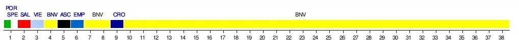 | Drużyna \ Kolejka | 1 | 2 | 3 | 4 | 5 | 6 | 7 | 8 | 9 | 10 | 11 | 12 | 13 | 14 | 15 | 16 | 17 | 18 | 19 | 20 | 21 | 22 | 23 | 24 | 25 | 26 | 27 | 28 | 29 | 30 | 31 | 32 | 33 | 34 | 35 | 36 | 37 | 38 |