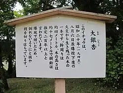 „Ten miłorząb jako jedyne drzewo [w tym ogrodzie] przetrwał burzę ogniową po bombardowaniu atomowym w dniu 6 sierpnia 1945 roku. Obwód pnia: około 4 m, wysokość: około 17 m, wiek drzewa: szacowany na ponad 200 lat. Jest przechylony przez podmuch, przycinanie gałęzi zapobiega jego upadkowi”.