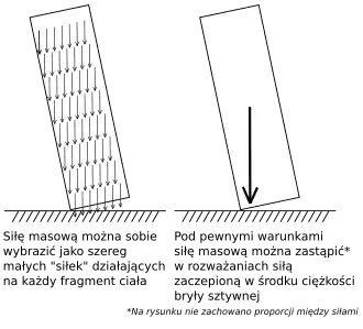 Siła działająca na ciało rozciągłe (bryłę) jest równa sumie sił masowych działających na każdy element ciała, odpowiada to całkowaniu, sił masowych działających na cząstkę ciała dla całej objętości ciała