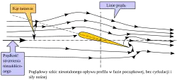 Na poglądowym szkicu (rys. 2) przedstawiony jest przepływ płaski wokół profilu wytwarzającego siłę nośną. Pokazany jest tu układ ciśnień i związane z nim pole prędkości, które odznaczać się musi (gdy istnieje siła nośna) istnieniem cyrkulacji, będącej charakterystyczną cechą takiego pola prędkości, którego składową jest ruch okrężny; cyrkulacja jest wtedy sumą iloczynów składowej prędkości stycznej do pokazanej na rysunku niebieskiej obejmującej profil krzywej przez długości odpowiadających elementarnych odcinków tej krzywej (i jest taka sama dla każdej innej krzywej zamkniętej obejmującej ten profil). Pokazany na rys. 2 przebieg linii prądu i rozkład ciśnień dotyczy stanu ustalonego.
