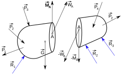 Przykładem są siły wewnętrzne działające w przekroju ciała z rys. 1 – są to: wektory główne[4] sił przekrojowych oraz wektory główne momentów przekrojowych otrzymane w wyniku redukcji układu sił do bieguna Zgodnie z III zasadą dynamiki, na przekroje obu rozdzielonych części ciała działają takie same co do wartości i kierunku, ale o przeciwnym zwrocie: dwójka sił przekrojowych oraz dwójka momentów przekrojowych