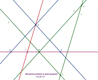 - Sieci związane są z quasi-grupami – jednym z rodzajów algebr uniwersalnych. Każdej quasi-grupie odpowiada pewna sieć i na odwrót, każdej sieci odpowiada pewna quasi-grupa, nazywana quasi-grupą współrzędnych sieci. Mnożenie punktów i w quasi-grupie składającej się z punktów prostej różowej (na rysunku) jest zdefiniowane następująco (patrz rysunek):