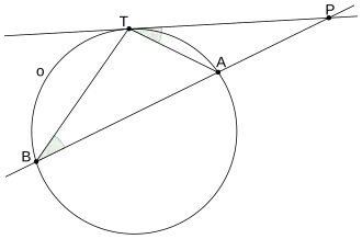 Poprowadźmy z punktu styczną i sieczną okręgu Punkt styczności nazwijmy a punkty przecięcia z sieczną i gdzie Kąt jest kątem wpisanym opartym na cięciwie więc przystaje do kąta dopisanego Trójkąty i mają wspólny kąt a ich pozostałe kąty są przystające, więc są podobne.
