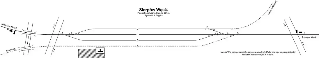 Widok na północną głowicę stacji Sierpów Wąsk. Widoczne rozjazdy 5 i 6. Brak toru 5 (zdemontowany)