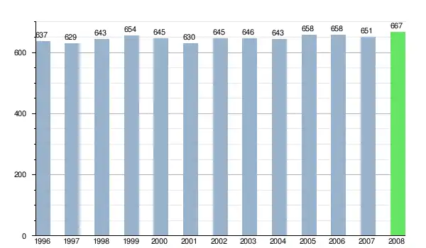 Według danych z dnia 31 grudnia 2012, wieś zamieszkiwało 640 osób, w tym 324 kobiety i 316 mężczyzn[7].