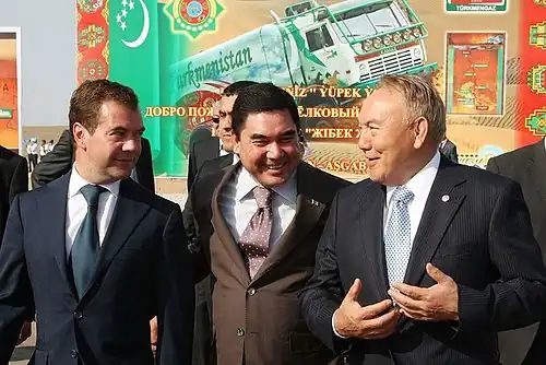 Kolejno od lewej: prezydent Federacji Rosyjskiej Dmitrij Miedwiediew, prezydent Turkmenistanu Gurbanguly Berdimuhamedow i prezydent Kazachstanu Nursułtan Nazarbajew na mecie Rajdu Jedwabnego Szlaku 2009 w dniu 13 września 2009 roku.