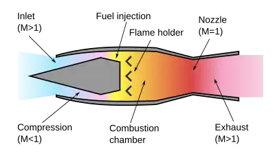 Komora spalania silnika strumieniowego jest ukształtowana tak, aby napływające z przodu powietrze zmniejszało prędkość przepływu i ulegało sprężaniu w dyfuzorze wlotowym. Stabilizatory mają za zadanie wytworzyć zawirowania mieszanki paliwowo-powietrznej. To pozwala zapalić mieszankę i utrzymać proces spalania. Przed zapłonem trzeba więc przepływ powietrza wymusić, najlepiej przez rozpędzenie całości do kilkuset kilometrów na godzinę.