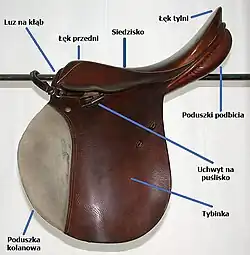 - dwie tybinki – duże płaty skóry po bokach siodła z poduszkami kolanowymi,
