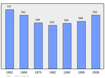 Według danych na rok 1990 gminę zamieszkiwały 544 osoby, a gęstość zaludnienia wynosiła 26 osób/km² (wśród 1545 gmin Langwedocji-Roussillon Siran plasuje się na 496. miejscu pod względem liczby ludności, natomiast pod względem powierzchni na miejscu 357.).