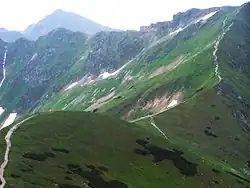 ![]() Siwa Przełęcz na skrzyżowaniu ścieżek. Nad nią Tomanowy Wierch Polski i Kamienista, jeszcze wyżej szczyty Tatr Wysokich | |