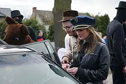 Na synkretyczny sposób doboru uczestników pochodu, wskazuje również postać policjanta, którego wygląd przywodzi na myśl prowodyra poznańskich pochodów żandarów[12]. Jest on niejako przywódcą grupy, posiada bowiem najwięcej funkcji w całym korowodzie. Jako osoba idąca na przedzie, z wyjątkiem uczestników biegających za dziećmi, wskazuje on trasę przejścia pochodu. Jego zadaniem jest zatrzymywać przejeżdżające samochody, wręczać kierowcom „mandaty świąteczne”, ale również pukać do wszystkich mijanych drzwi, w celu przyjęcia i ugoszczenia uczestników grupy. Poza tym to on gromadzi datki przekazywane na rzecz pochodu, które wręczają mu odwiedzani przechodnie, kierowcy i domownicy. Policjantem jest osoba przebojową, otwarta i gadatliwa, która potrafi zarówno zintegrować grupę, jak i rozweselić gospodarzy.