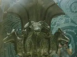 Podstawowym zdobieniem jest osiem postaci zwierzęcych umiejscowionych między brzuścem dzbana, a górną kielichowatą częścią. Na każdej ściance znajduje się głowa mitycznego stworzenia (smoka?), której wężowate ciało wije się w obie strony, łącząc z płynnie z postacią na kolejnej ścianie i tworząc w ten sposób ciągły ornament. Na rogach naczynia artysta umieścił duże baranie głowy, przekształcając równocześnie całą dolną część dzbana tak, by składała się ona z czterech połączonych tułowi, z nogami stanowiącymi równocześnie podstawę naczynia[1]