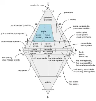 - obojętne (pośrednie) – 53-66% SiO2 (w środkowej części diagramu QAPF);