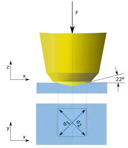 Pomiar twardości metodą Vickersa polega na wgnieceniu w powierzchnię badanego materiału czworobocznego foremnego ostrosłupa diamentowego o kącie wierzchołkowym 136° pod zadanym statycznym obciążeniem F i zmierzeniu przekątnych d powstałego odcisku w kształcie kwadratu.