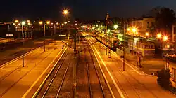 ![]() Budynek dworca – widok od strony peronów nocą | |