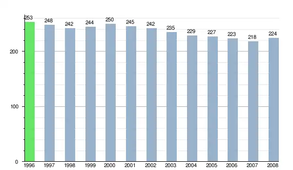 Według danych z dnia 31 grudnia 2012, wieś zamieszkiwało 257 osób, w tym 131 kobiet i 126 mężczyzn[6].