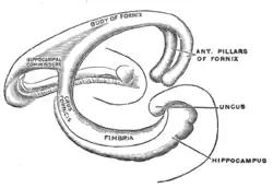 Z tyłu włókna trzonu sklepienia prawego i lewego znacznie oddalają się od siebie. Tworzą one dalej obustronnie odnogę sklepienia (crus fornicis). Zagina się ona ku dołowi i łukowato otacza powierzchnię grzbietową wzgórza, przechodząc następnie w strzępek hipokampa (fimbria hippocampi), leżący w ścianie rogu dolnego komory bocznej. Między odnogami sklepienia znajduje się blaszka zbudowana z poprzecznie biegnących włókien nerwowych, tworzących spoidło sklepienia (comissura fornicis).