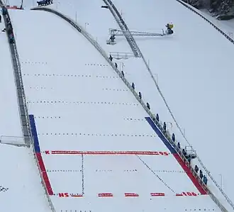 - 1 2 Ski Jumping: Jumping Hill. s. 224. [dostęp 2025-05-17]. Cytat: The landing slope must be clearly marked with a blue line for the "norm point", a red line for the "critical point" which marks the beginning of the transition curve or out-run. Midway between these is the "table point" (green line) (ang.).