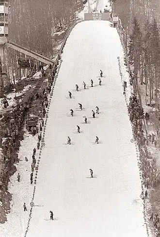 - ↑ E. John B. Allen. A Short History of U.S. Ski Jumping. „Skiing Heritage Journal”. 18, s. 38, 2006-03. International Skiing History Association. ISSN 1082-2895. Cytat: In the 1930s, the FIS stipulated that 70-meter hills were the largest permitted for ski jumping (…). (ang.).
