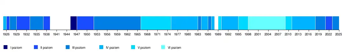 | Sezon | Poziom | Rozgrywki | Miejsce | Mecze | Punkty | Zwycięstwa | Remisy | Porażki | Bilans bramkowy | Uwagi | Puchar Polski (rozgrywki centralne) | |