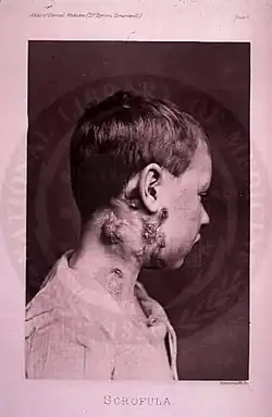 Choroba uaktywnia się na skutek złych warunków higienicznych, głównie u dzieci ze skłonnością do odczynów wysiękowych. Przy skrofulozie, prócz umiejscowienia zmian chorobowych w węzłach chłonnych szyi (co daje efekt w postaci opuchlizny), występuje również przewlekły nieżyt nosa i objawy zapalne spojówek[1]. Współcześnie ze względu na poprawę opieki medycznej skrofuloza występuje rzadko; dawniej dotykała w szczególności źle sytuowane rodziny wielodzietne[1].
