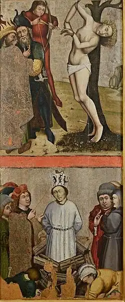 | Ścięcie Jakuba Większego/ Śmierć św. Wawrzyńca | Męczeństwo św. Sebastiana / Spalenie na stosie Jana Husa |