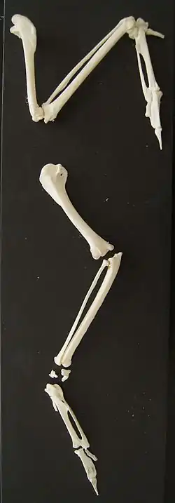 U ptaków skrzydłem jest przekształcona pierwsza para kończyn. Szkielet skrzydła ptaka składa się z kości ramieniowej (humerus), dwóch zrośniętych ze sobą kości przedramienia (kość łokciowa (ulna) i kość promieniowa (radius)), dwóch kostek powstałych ze zrośnięcia kości pierwszego szeregu nadgarstka oraz kości nadgarstkowo-dłoniowej (carpus-metacarpus). Kość nadgarstkowo-dłoniowa składa się z kolei z dwu wydłużonych i zrośniętych ze sobą na obu końcach kości nadgarstka, tworząc trzy palce z czego środkowy jest dwuczłonowy, a pozostałe dwa skrajne są jednoczłonowe.