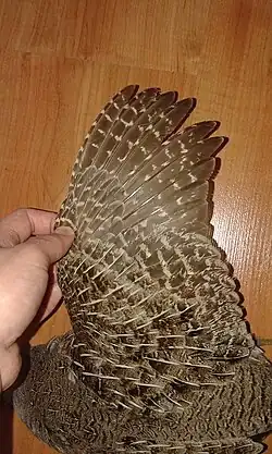 - Musculus cucullaris, mniej lub bardziej zakryty przez mięsień zwieracz szyi – przeważnie ma formę cienkiej, powierzchownej warstwy mięśniowej, rozpoczynającej się z tyłu głowy i sięgającej po obojczyk. Jego skurcz umożliwia fałdowanie się skóry i tym samym stroszenie piór na szyi[13].