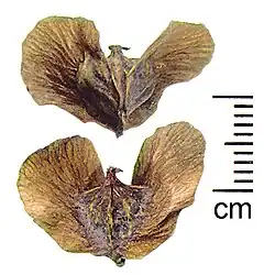 - Orzeszki z dwoma skrzydełkami osiągają o około 1 cm długości. Owocostany zwisające długości do 40 cm[6][7].
