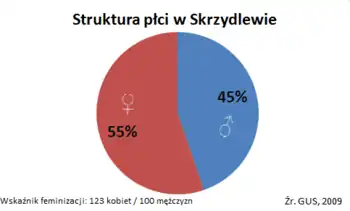 Struktura płci w Skrzydlewie wykazuje zdecydowaną przewagę kobiet nad mężczyznami. Wskaźnik feminizacji w roku 2009, wynosił 123 kobiety na 100 mężczyzn[10] i tym samym był drugim z najwyższych w gminie[b].